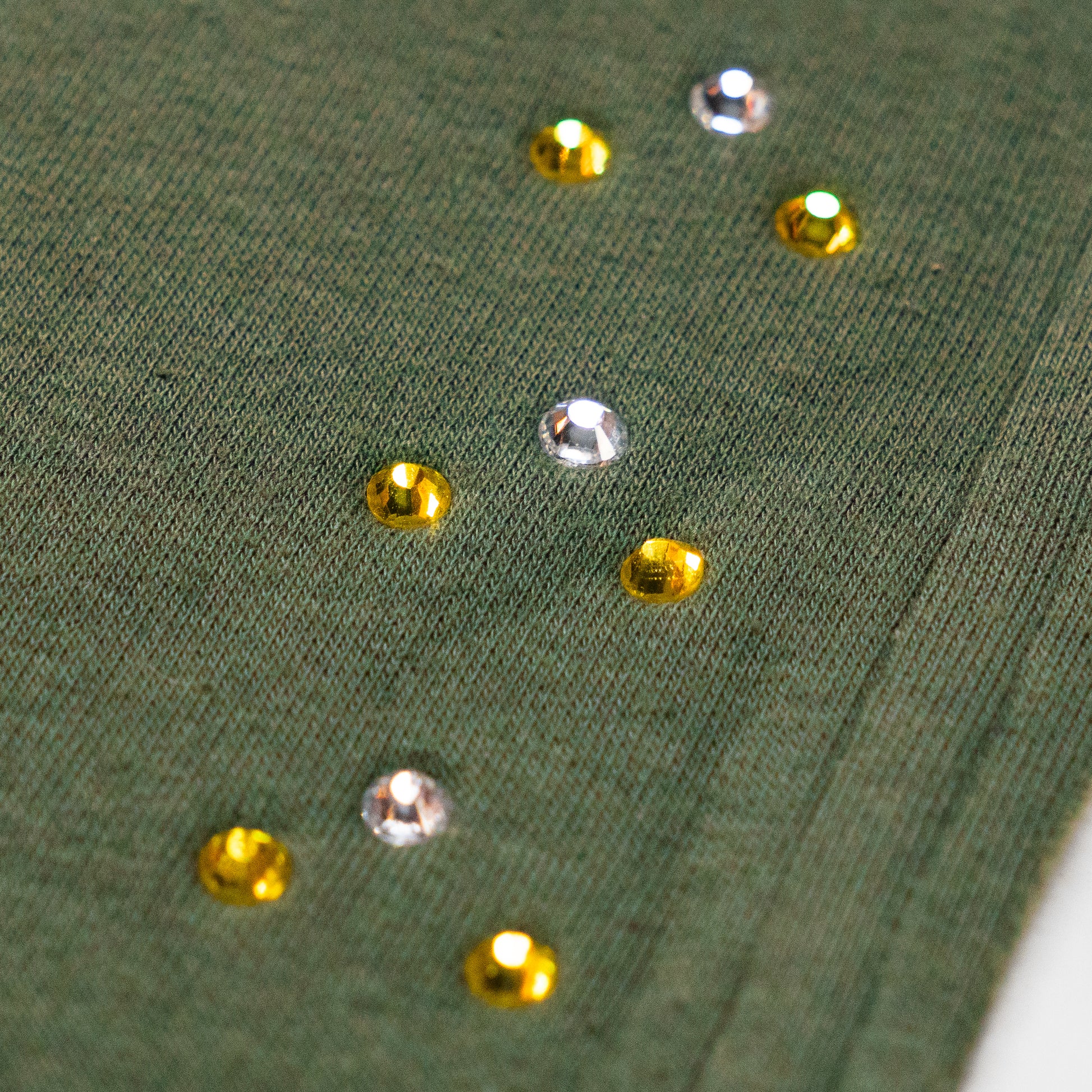 MUTED GREEN MID-WEIGHT FLEECE, PINTUCKED, CRYSTALS ALONG THE SIDE, LEFT POCKET EMBROIDERY, UNFINISHED BOTTOM HEM