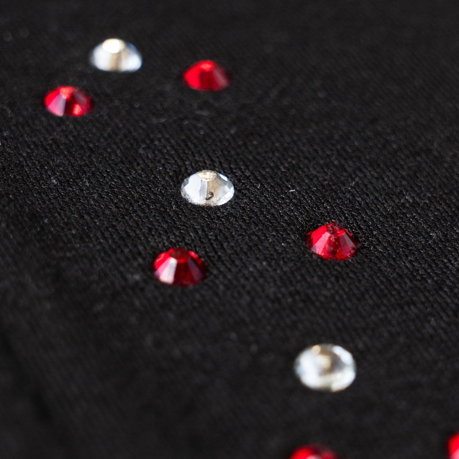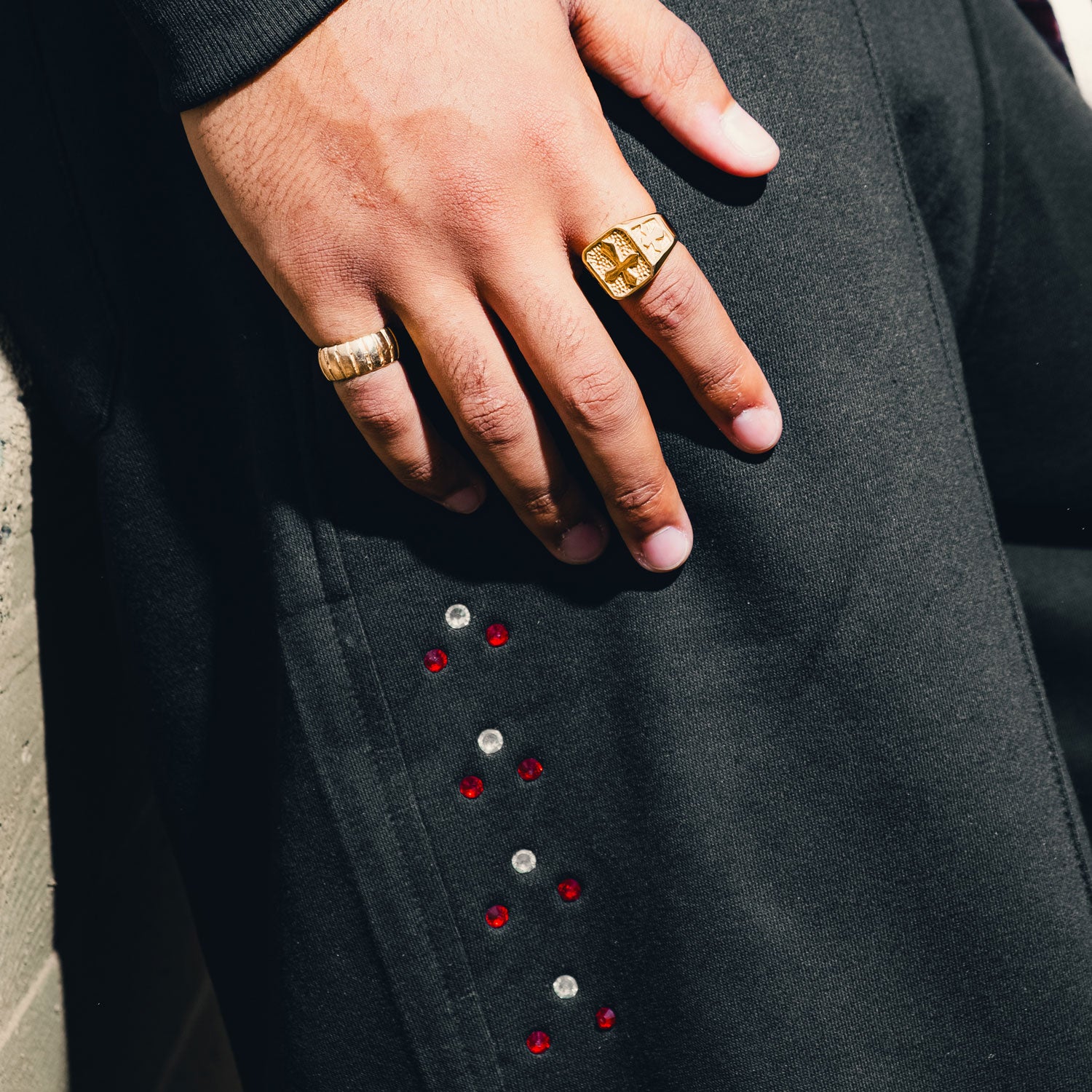 HEATHER GREY MID-WEIGHT FLEECE, PINTUCKED, CRYSTALS ALONG THE SIDE, LEFT POCKET EMBROIDERY, UNFINISHED BOTTOM HEM