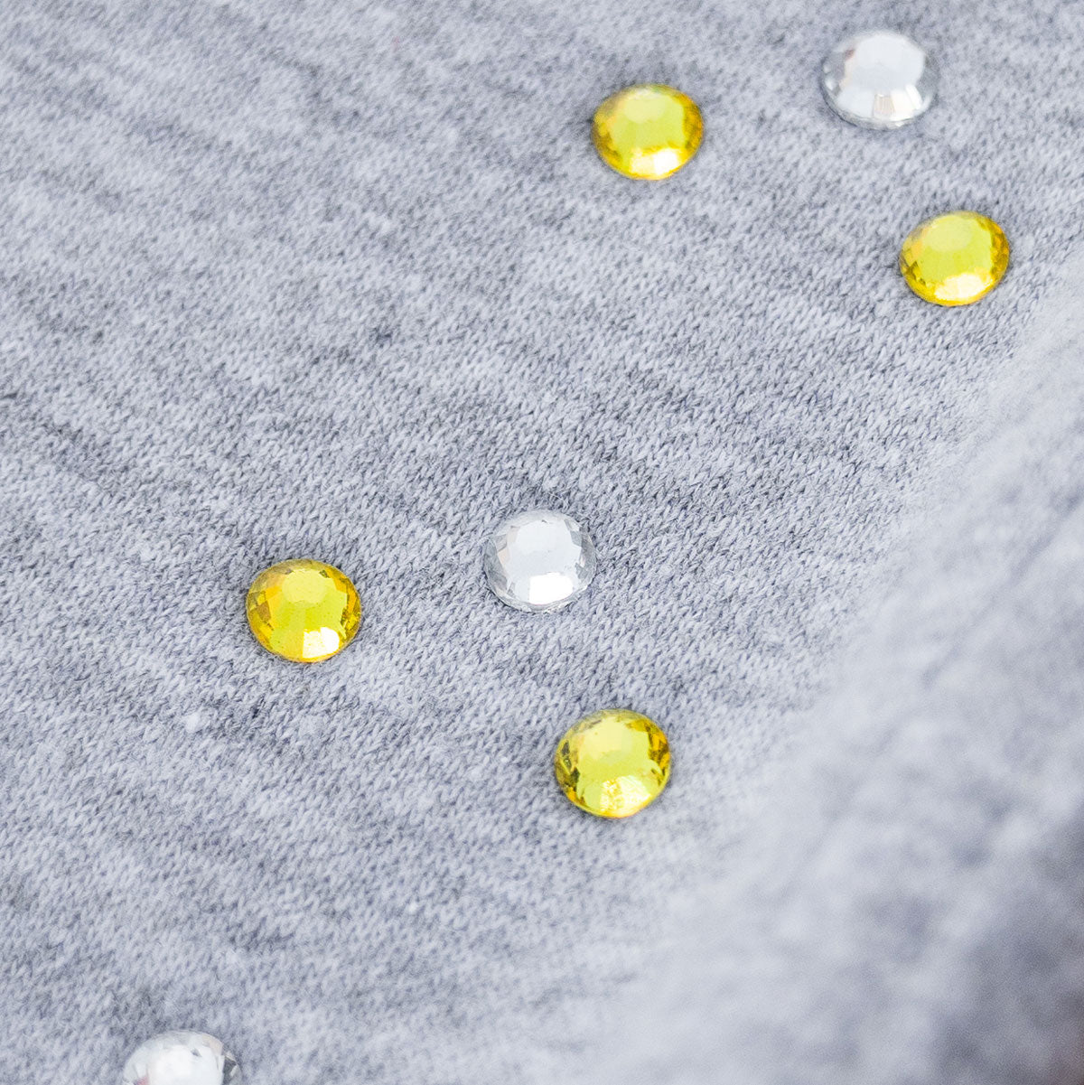 HEATHER GREY MID-WEIGHT FLEECE, PINTUCKED, CRYSTALS ALONG THE SIDE, LEFT POCKET EMBROIDERY, UNFINISHED BOTTOM HEM